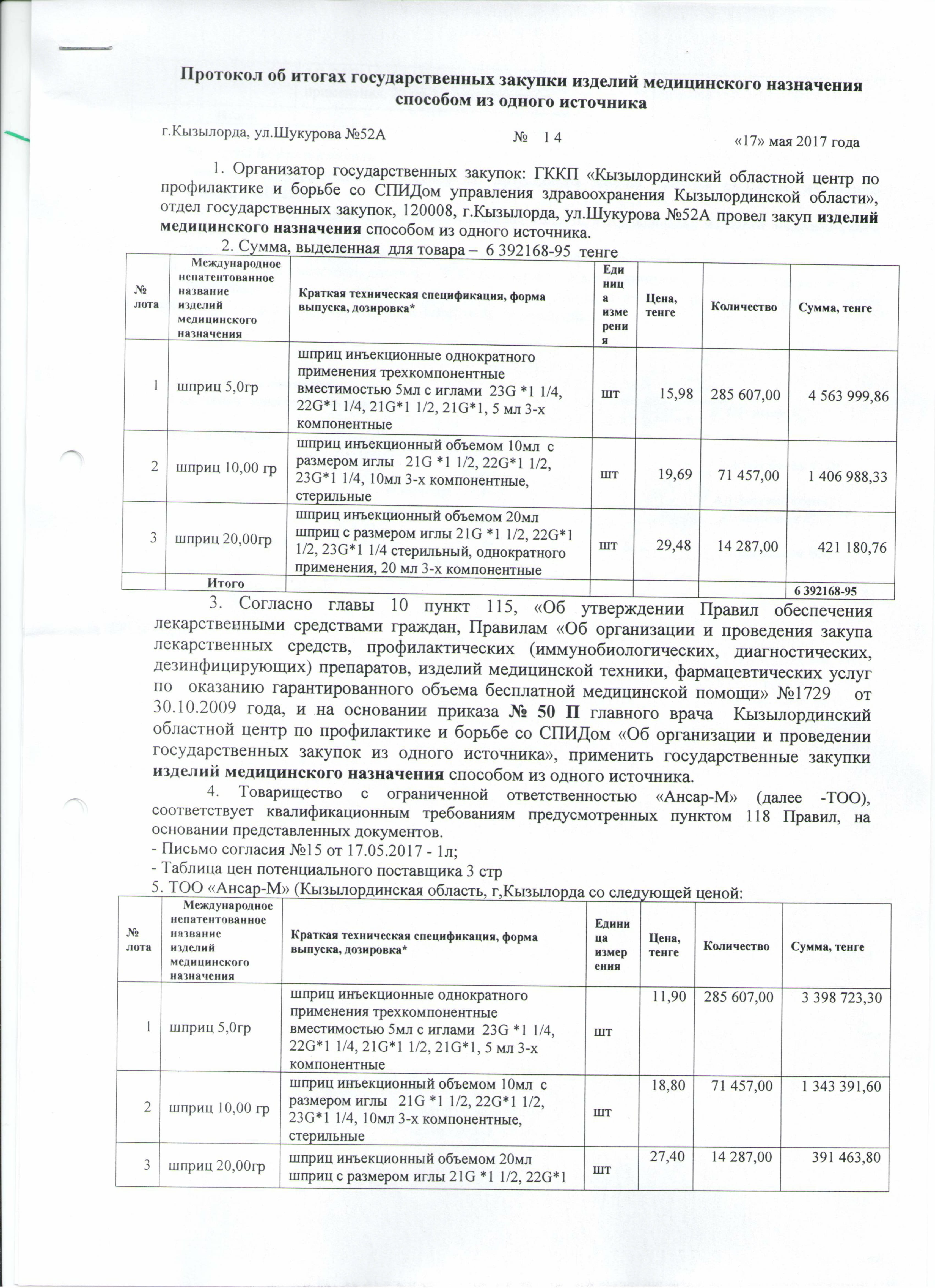 Протокол об итогах государственных закупок изделий медицинского назначений способом из одного источника