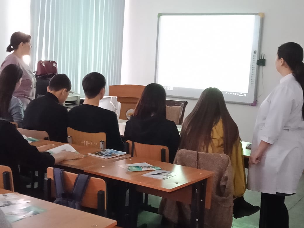 Бүгін ЖИТС-тің алдын алу және оған қарсы күрес жөніндегі орталықтың дәрігер эпидемиолог көмекшілері Қ.Бекова және И.Касымова, Қызылорда көпсалалы Ұлағат колледжі студеттері арасында «АИТВ инфекциясының індеттік ахуалы, жұғу жолдары. АИТВ –дан сақтану шаралары.